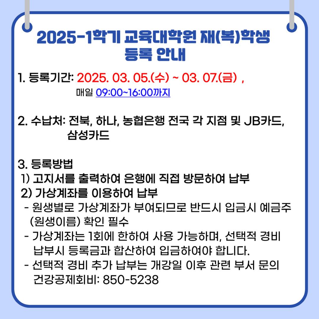 2025학년도 1학기 교육대학원 재(복)학생 등록일정 및 수납처 안내 1. 등록기간 : 2025.03.05(수) ~ 07(금), 3일간, 매일 09시~16시 2. 수 납 처 : 전북은행, 하나은행, 농협은행 전국 각 지점 및 JB카드, 삼성카드 3. 고지서 출력 : 원광대학교 웹정보서비스 로그인→대학원용 정보서비스→등록고지서