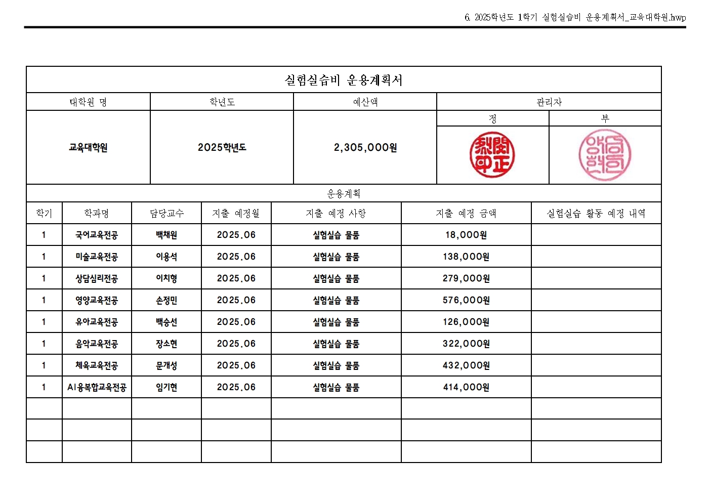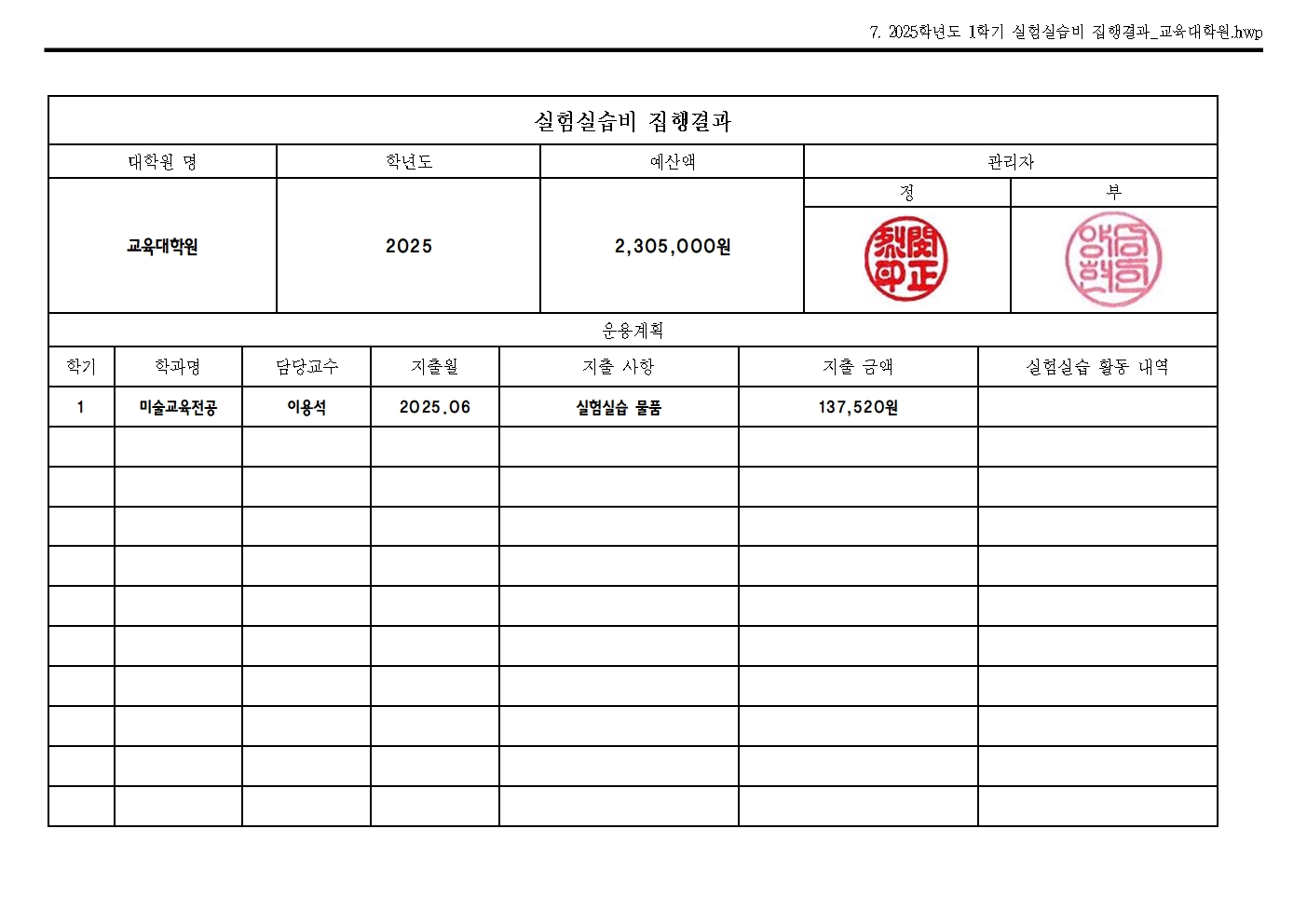 자료실 홈알림마당자료실 2025학년도 교육대학원 실험실습비 운영계획서 및 집행결과 안내 2025학년도 교육대학원 실험실습비 운영계획서 및 집행결과 안내 교육대학원2025-11-05 페이스북 트위터 구글플러스 이메일 프린트 2025학년도 교육대학원 실험실습비 운영계획서 2025학년도 1학기 실헙실습비 운영계획서 2025학년도 교육대학원 실험실습비 집행결과 2025학년도 1학기 실헙실습비 집행결과 이전자료실